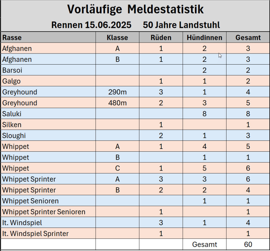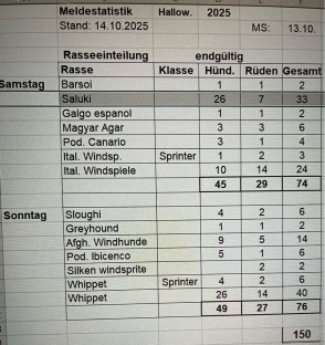 Wie ersichtlich fehlen bei einigen Rassen noch Hunde zum Erreichen der notwendigen Teilnehmerzahl.